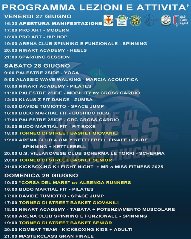 Il prossimo Venerdì 27, Sabato 28 e Domenica 29 giugno in piazza De Andrè e sul lungomare di Albenga, infatti, il fitness si unirà a un “Un mare di emozioni” moltiplicando così le proposte e il divertimento per cittadini, visitatori e turisti.